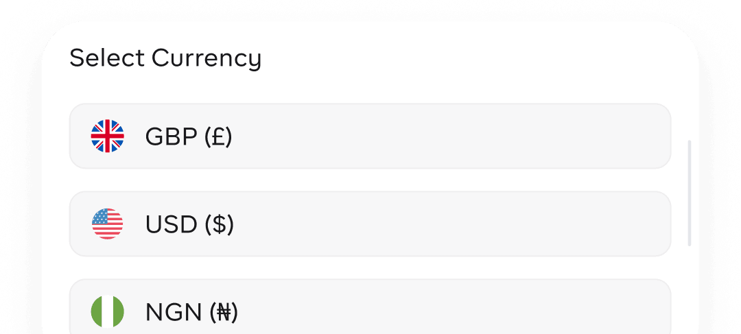 Send and receive in: USD • EUR • GBP • NGN • KES • GHS • ZAR • PHP • INR • AED • and more coming soon